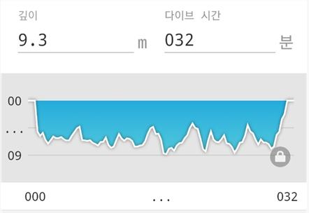 컴퓨터 기록상으론 9.3m 로 찍힘 - 수심이 낮아서 안전정지는 안해도 된다고 하지만, 그래도 돌아다니면서 이퀄라이징은 하긴 해야함