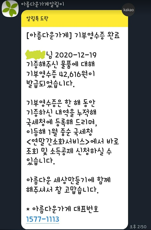 기부를 하고나면, 2주 정도 있따가 아래와 같이 기부영수증이 발급됬다는 카톡이 온다.