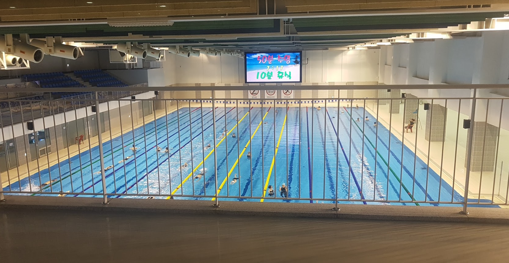 50m 수영장에 레인은 10개다. 한쪽에 관중석이 있어서 천장은 높은 편임.