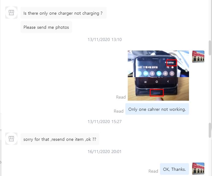 안보는건지 사진을 달라고 해서 사진으로 보낸 뒤에 새로 보내주겠다는 답변을 받음.