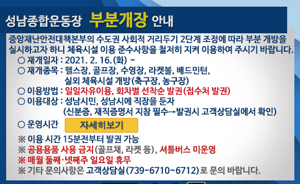 성남시에서 운영하는 체육센터들이 2021년 2월 중순부터 부분 재개장을 다시 시작했다.