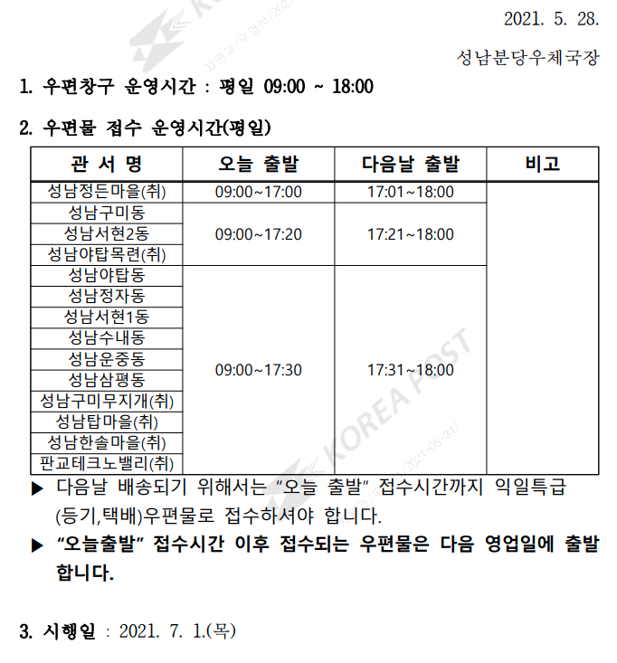 오후 5시 20분까지 보낸 등기의 경우 다음날 도착이 보장된다.