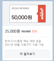 온더보더에서 이용가능한 "5만원권을 30% 할인된 가격"에 구매하실 수 있는 예약상품권입니다.