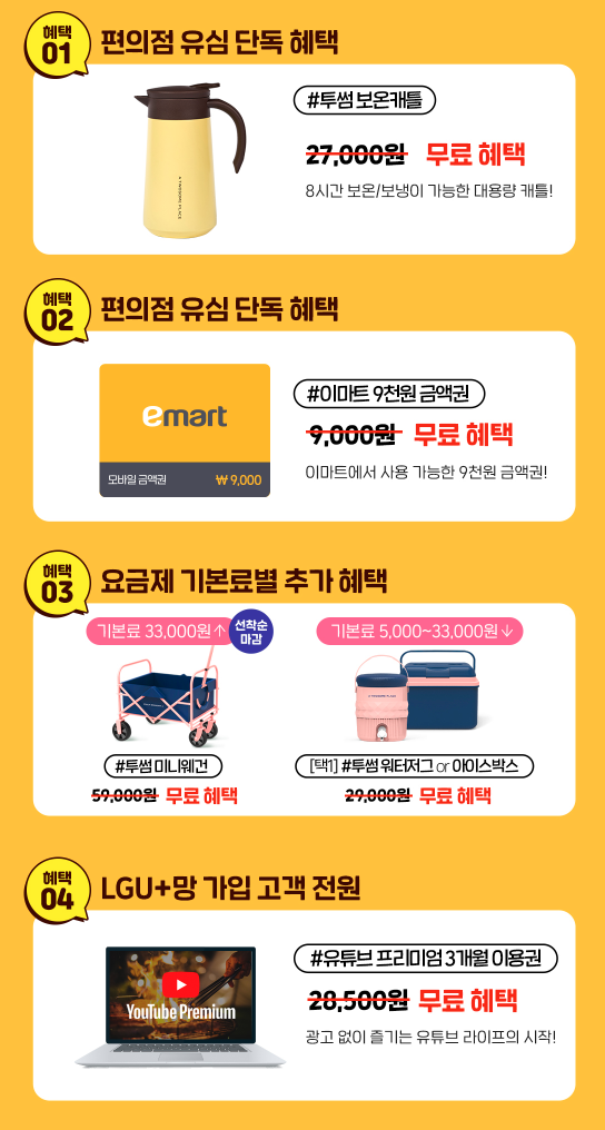지금 7월 행사기간에 편의점에서 유심을 사는 경우, 아래와 같은 4가지 혜택이 딸려옴.