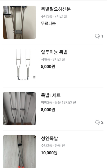 목발은 1-2달 정도 쓰고나면 안쓰는 경우가 많아서, 당근에서 검색하면 생각보다 올라온 물건이 많다.