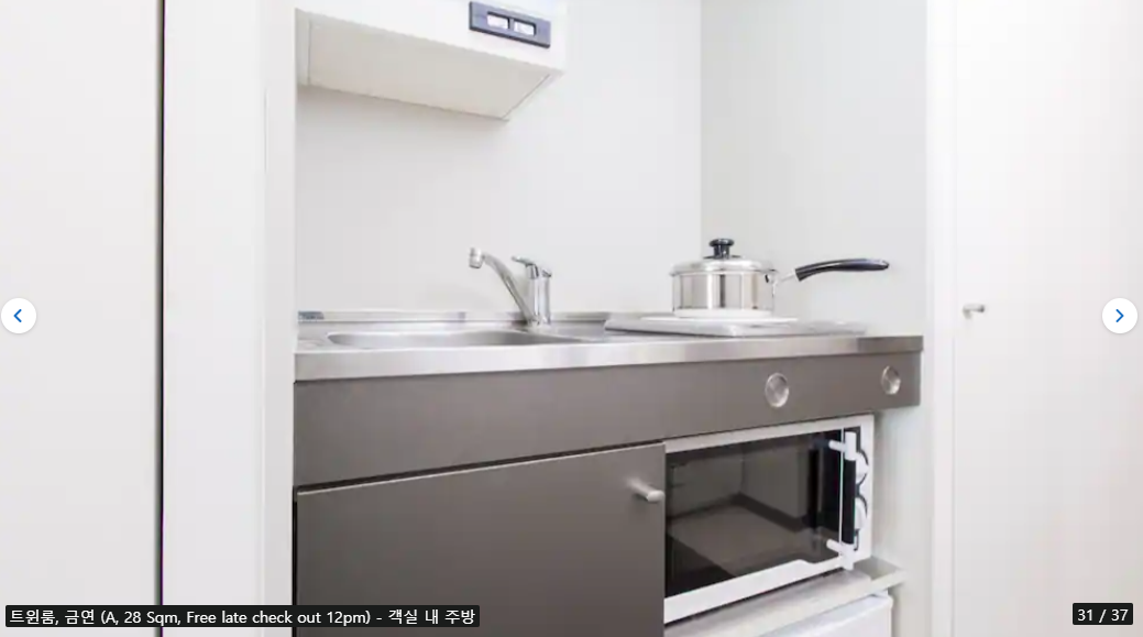 일단 아침을 앉아서 먹을 수 있는 작은 쇼파와 테이블이 있다는 것도 좋았고 간단한 요리를 할 수 있는 미니주방에 전자렌지도 갖추어져 있는데다, 세탁기 겸 건조기도 있다.
