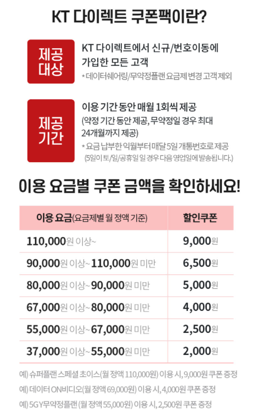 추가로, 다이렉트 쿠폰팩이란게 매월 날라오게 되어있는데, 4만원 정도 요금제로 했을 때 2,000원 쿠폰을 받을 수 있다.