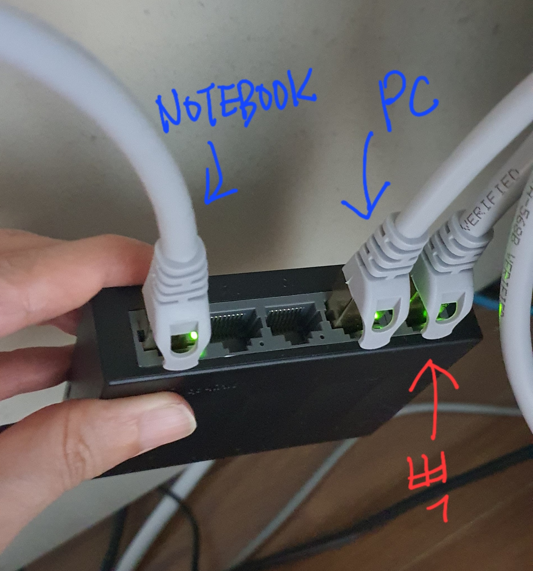 여튼.. 스위칭허브엔 똑같은 랜선 멍이 여러개인데.. 구분없이 그냥 벽에서 나온 랜선과, 노트북, PC연결용 랜선을 꼽으면 알아서 분배해준다. 난 편의상 아래와 같이 한쪽에 벽이랑 PC선을 꼽고 반대편에 노트북 선을 연결했다.