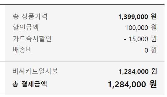 기본가격에서 쿠팡에서 10만원 할인쿠폰에 카드사 할인 받아서 최종가격은 1,284,000원