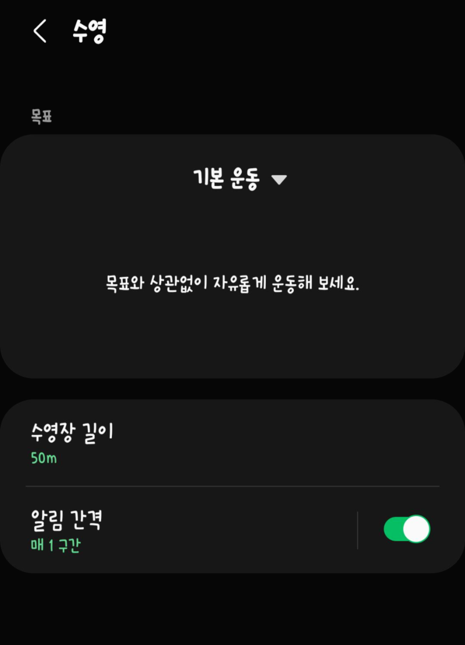 50m 설정하려면, 폰의 갤럭시 웨어러블 앱에서 헬스설정 > 운동관리 > 수영 선택하면
