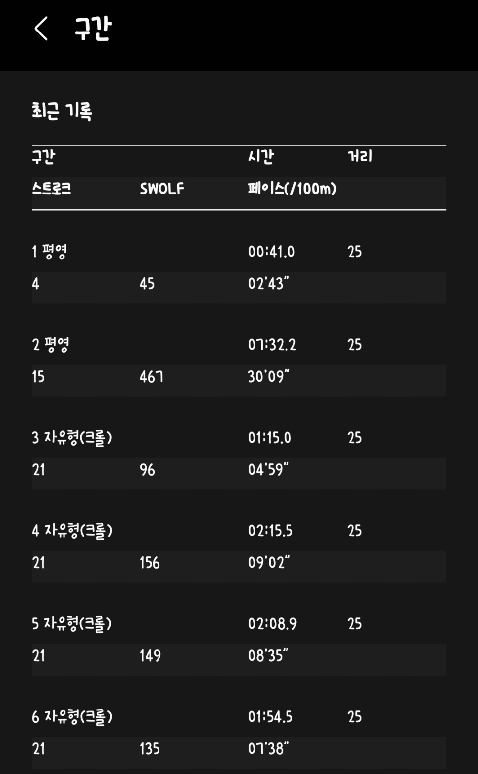 게다가 처음 기록하다보니, 수영장이 50m 인데 25m인 값으로 셋팅되서 기록되버렸다. (기록 이후 수영장 길이 수정 불가)