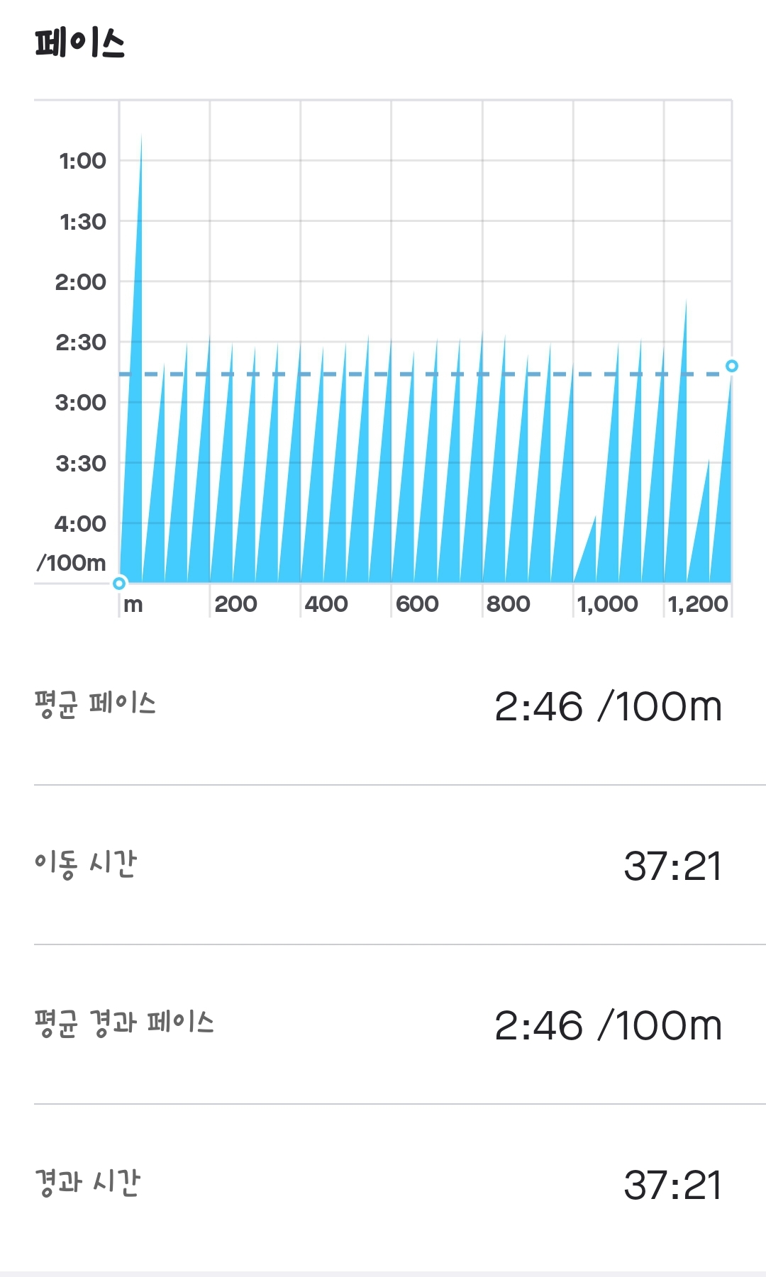 한번 편도로 갈 때의 100미터 기준의 시간값 그래프를 볼 수 있다.