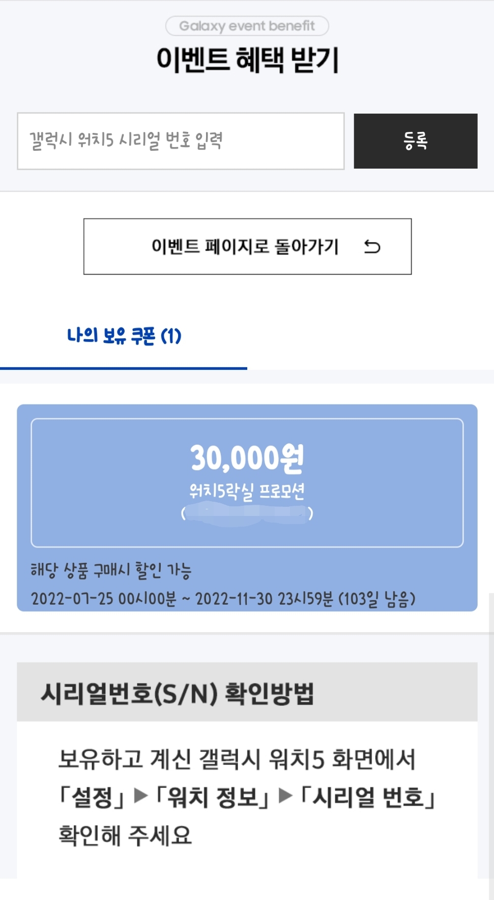 이벤트 쿠폰 발급하기 선택하면 아래 페이지로 이동하고, 갤럭시워치5의 시리얼 번호를 입력 하면 쿠폰이 발급된다.