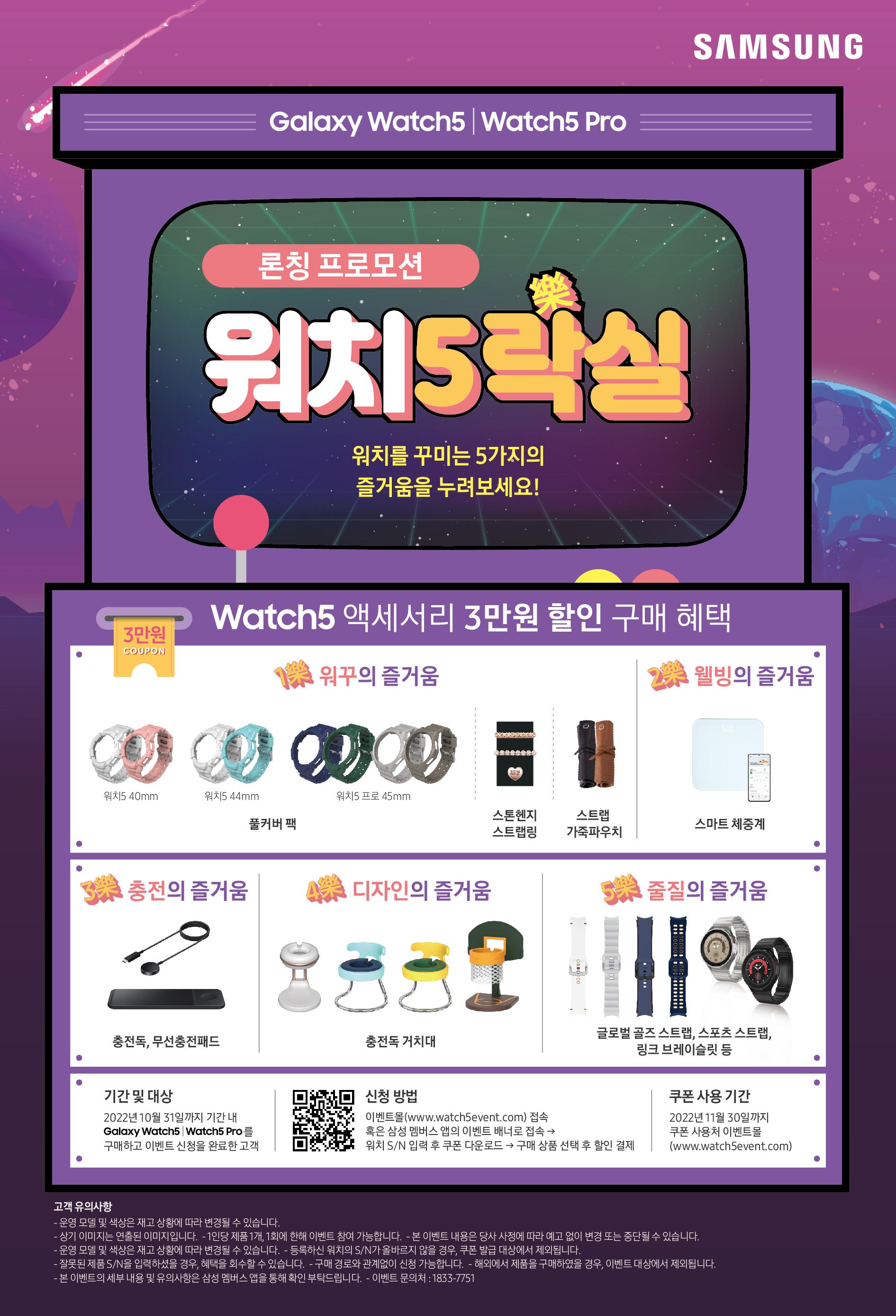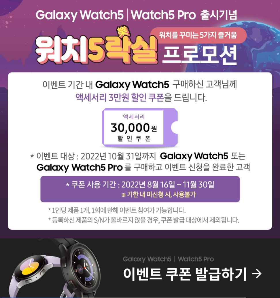 갤럭시워치5/워치5프로 구매자는 아래 사이트로 가면 삼성 정품 액세서리를 구매할 때 사용가능한 3만원 쿠폰을 발급받을 수 있다.