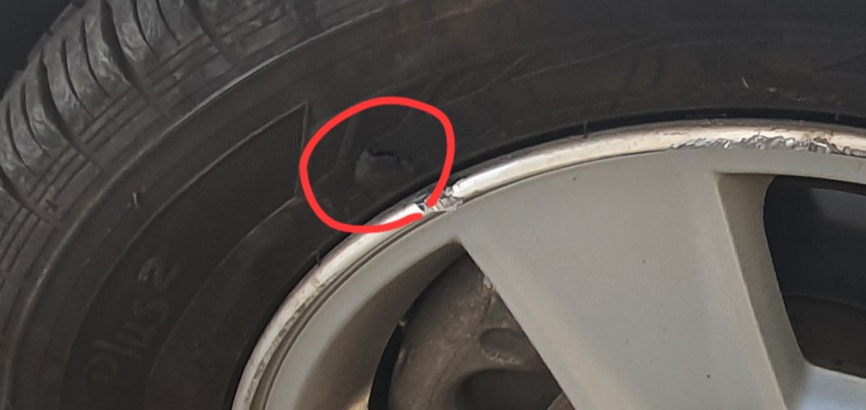 아래 사진에서 빨간색으로 동그라미친 부분이다. 긴급출동 아저씨 말로는 타이어가 원래 저 부위가 엄청 약하다고..
