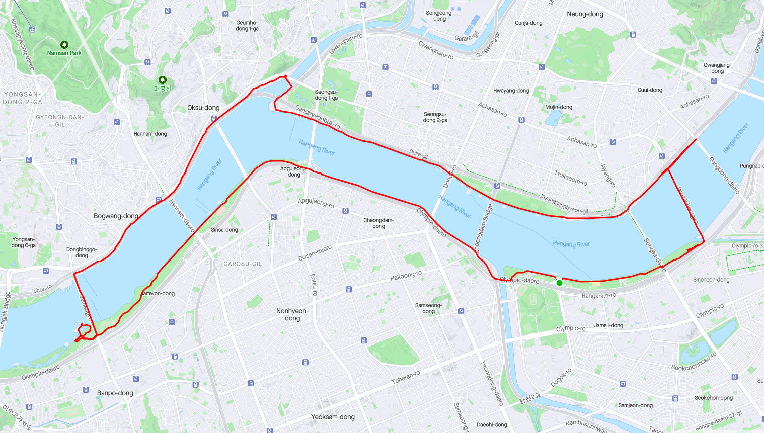 잠실철교로 건너야 하는지 몰라서 좀 더 지나갔다가 되돌아와서 건너오고.. 다시 갈림길에서 조금 헤매서 완벽하진 않지만 그렇게 시속 19km 정도로 타니 1시간반 정도 걸렸다.