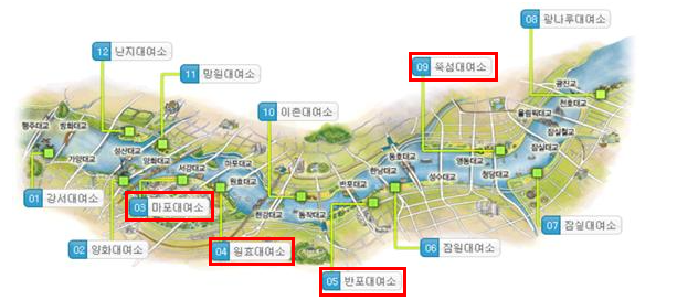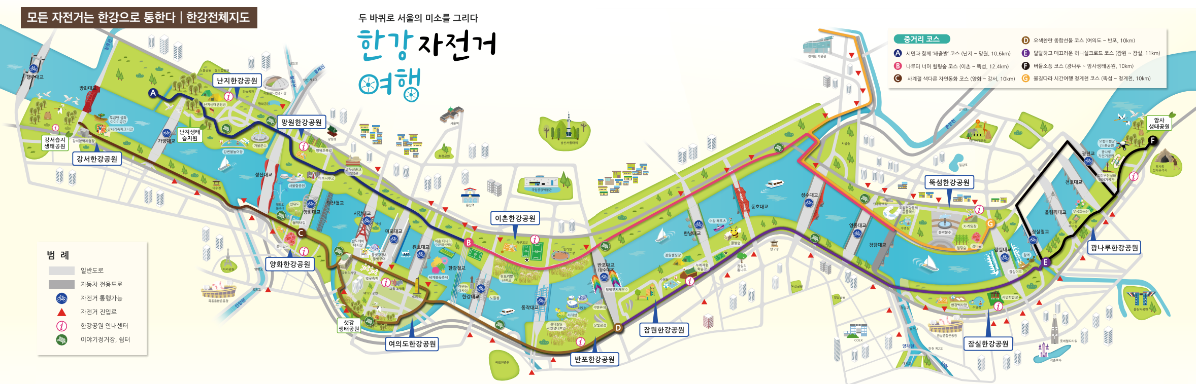 서울 한강에서 자전거 탈 때 참고하면 좋을 지도이다.