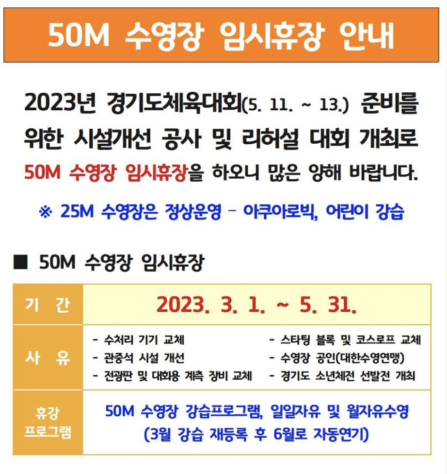 | 성남종합스포츠센터 수영장 2023년 3월 운영 재개 (0) | 2023.02.25 |