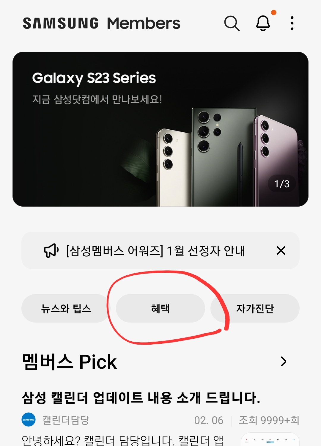 갤럭시S23 폰에 설치되어 있는 멤버스앱을 연다.