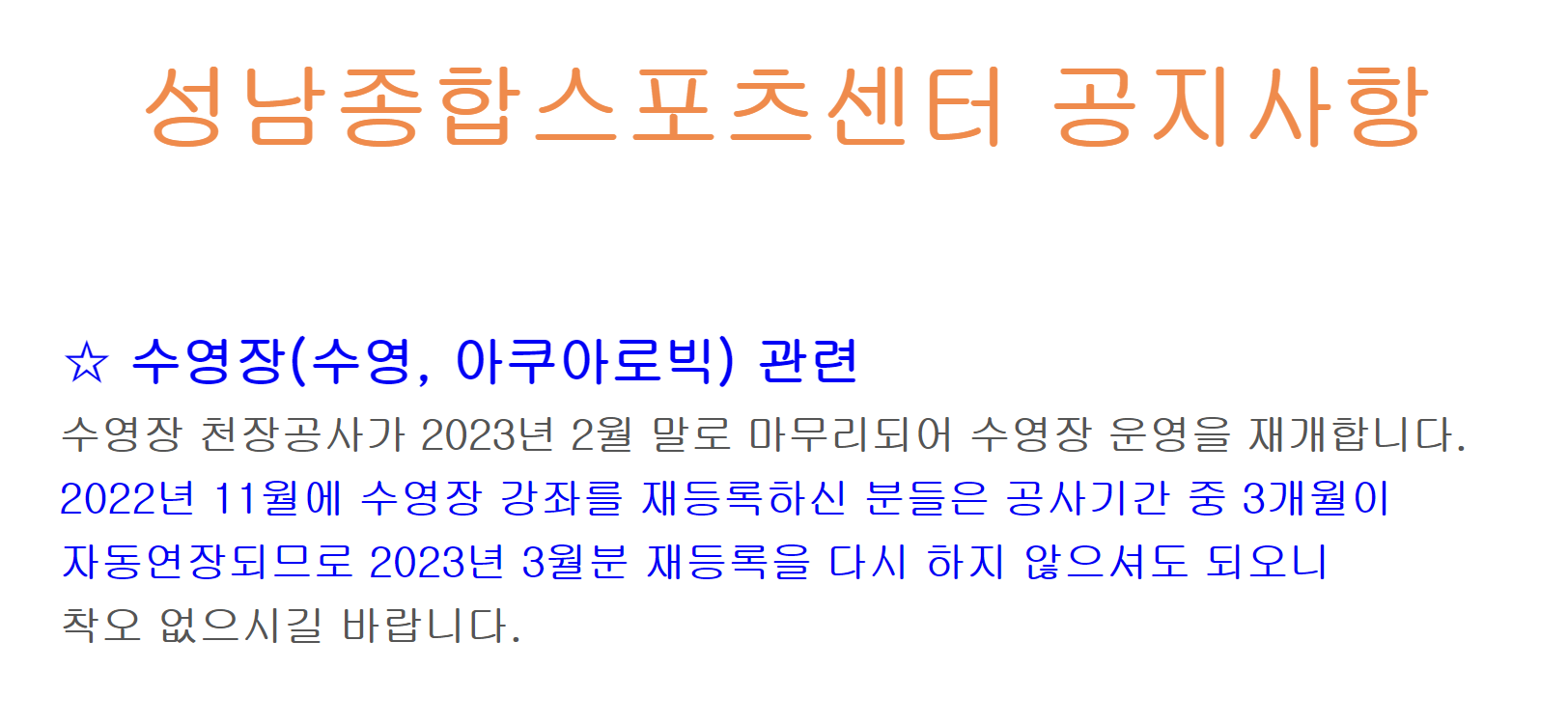 2023.02.11 - 성남 탄천 종합운동장 - 50M 수영장 임시휴장 소식 (23년 3월~5월)
