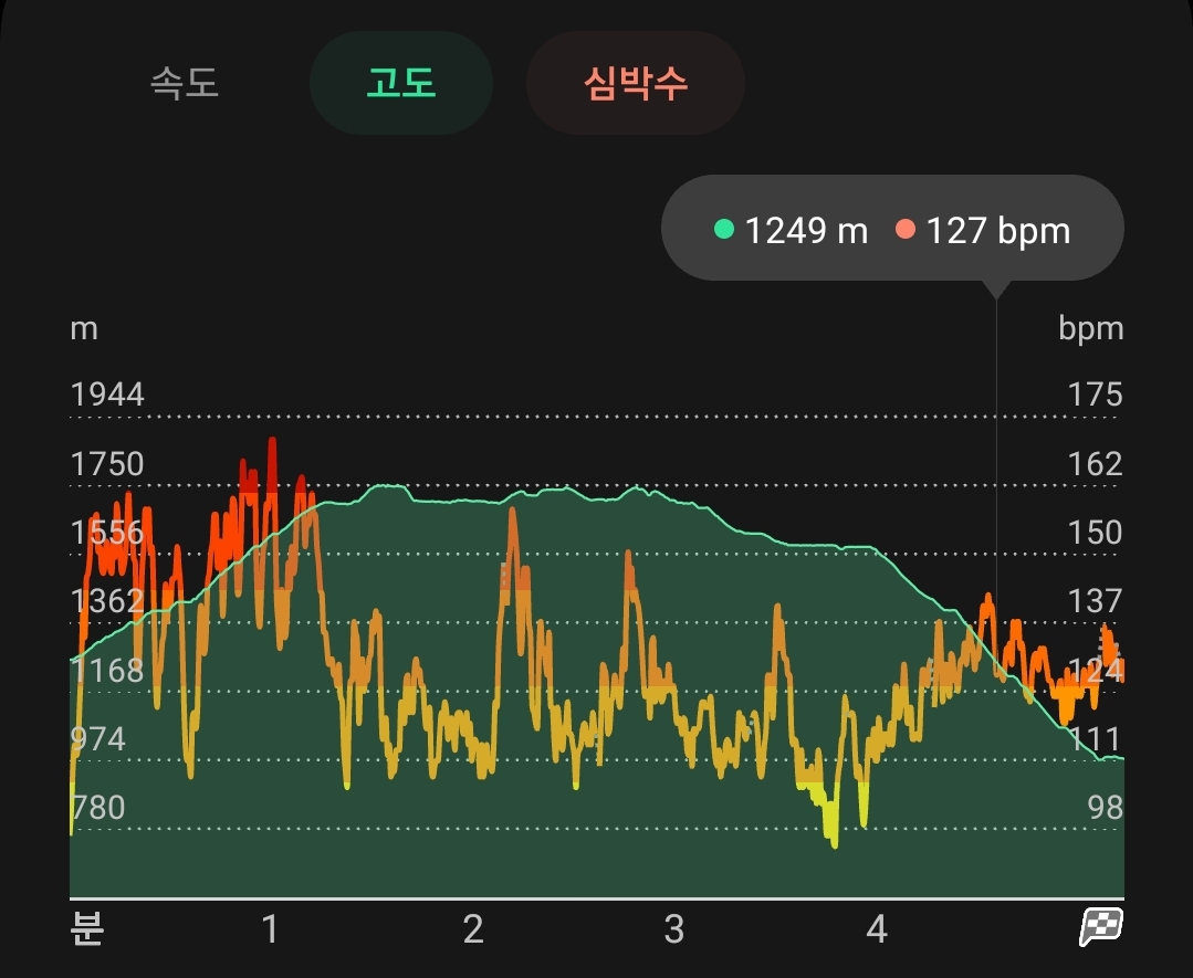 하산할 때는 막판에 좀 힘들었는지 심박수가 내려가다 올라간 것으로 나오넹...