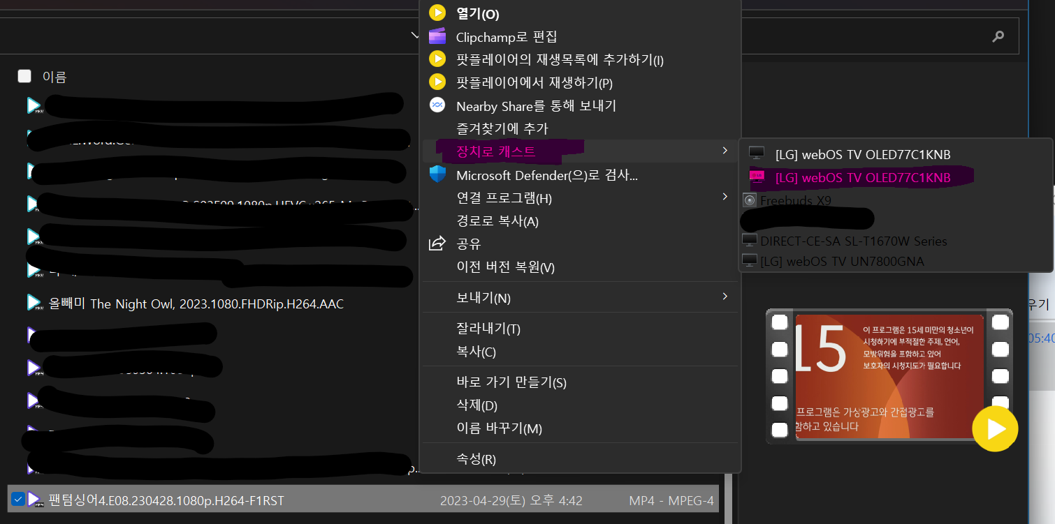 TV로 보고싶은 파일을 선택하고 마우스 우클릭을 해서 나온 메뉴에서 "장치로 캐스트"를 선택하면