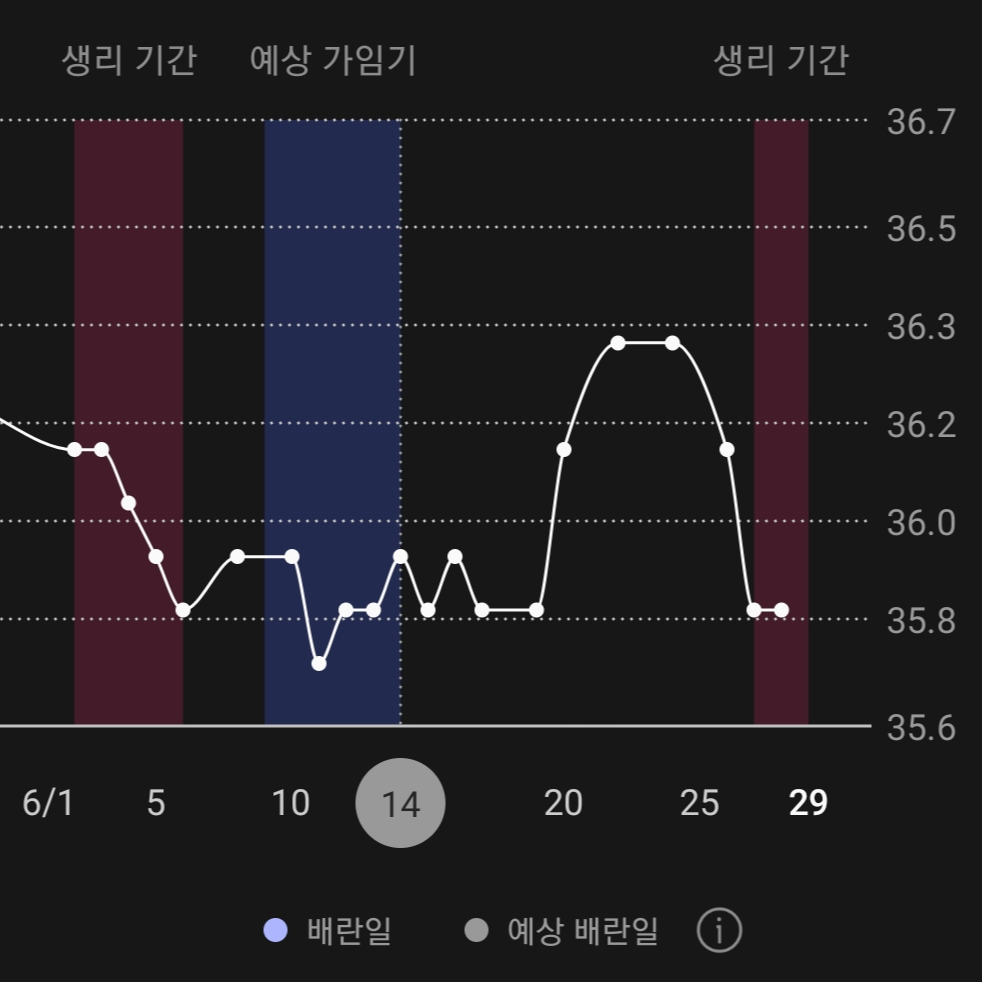 위 사진을 보면 생리가 시작하기 전에 체온이 35도 근사치에서 36도 이상으로 올라가는게 보인다.