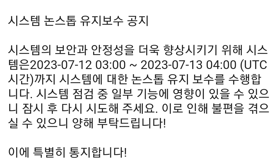 그리고 아주잠깐 로그인에 성공했을때 앱 상단에 "시스템 논스톰 유지보수 공지" 배너가 떠있는걸 확인..