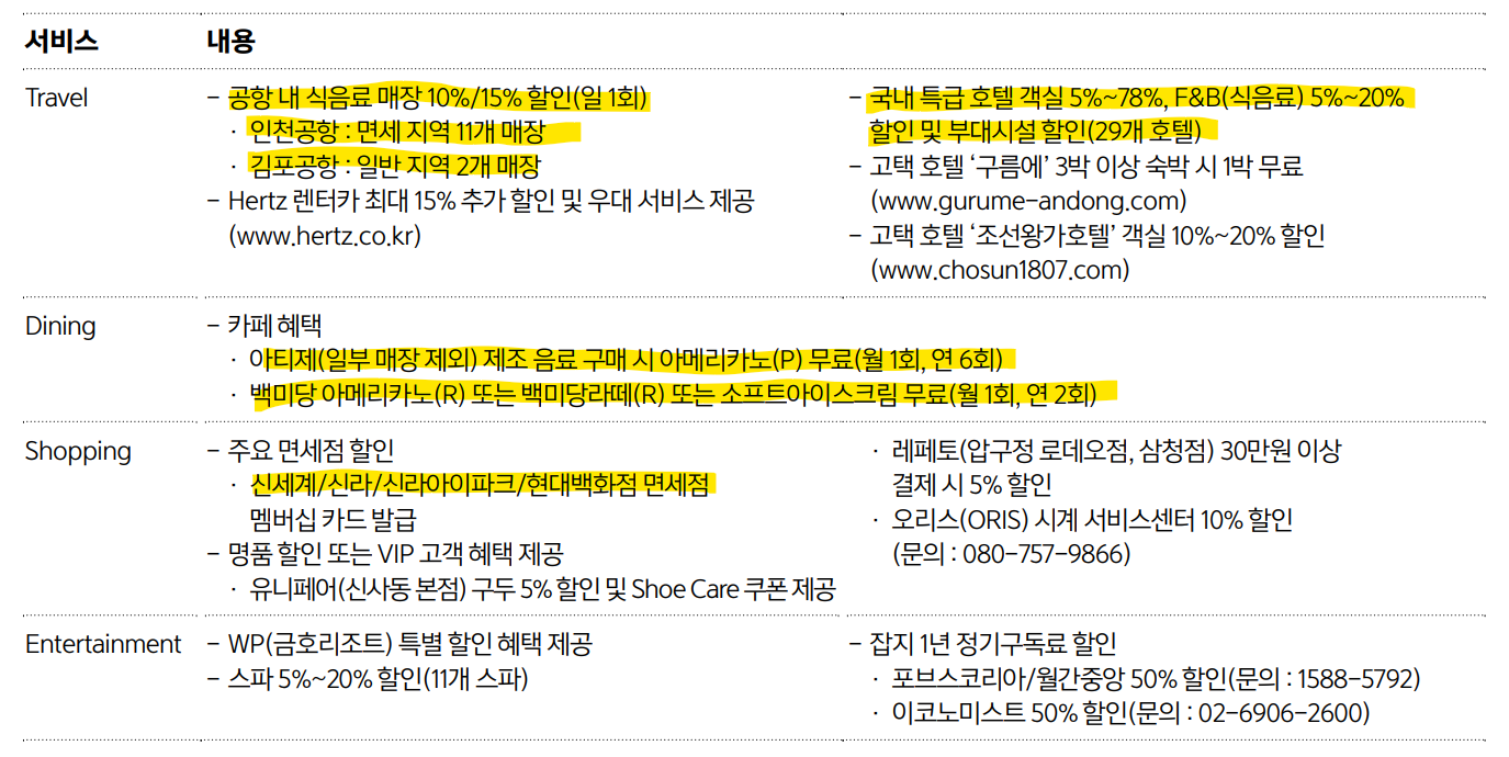 아멕스에서 제공하는 플래티늄 혜택만 정리해놨다.