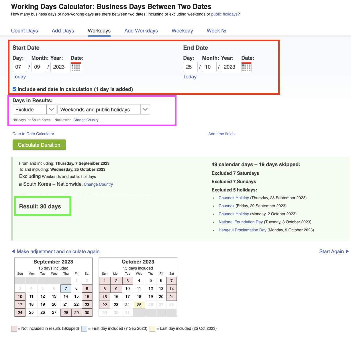 계산기 사이트 : https://www.timeanddate.com/date/workdays.html