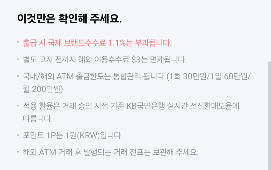 위에 써있는 대로 국제브랜드 수수료 1.1% 는 부과되고, 해외이용수수료 3$는 면제이다.