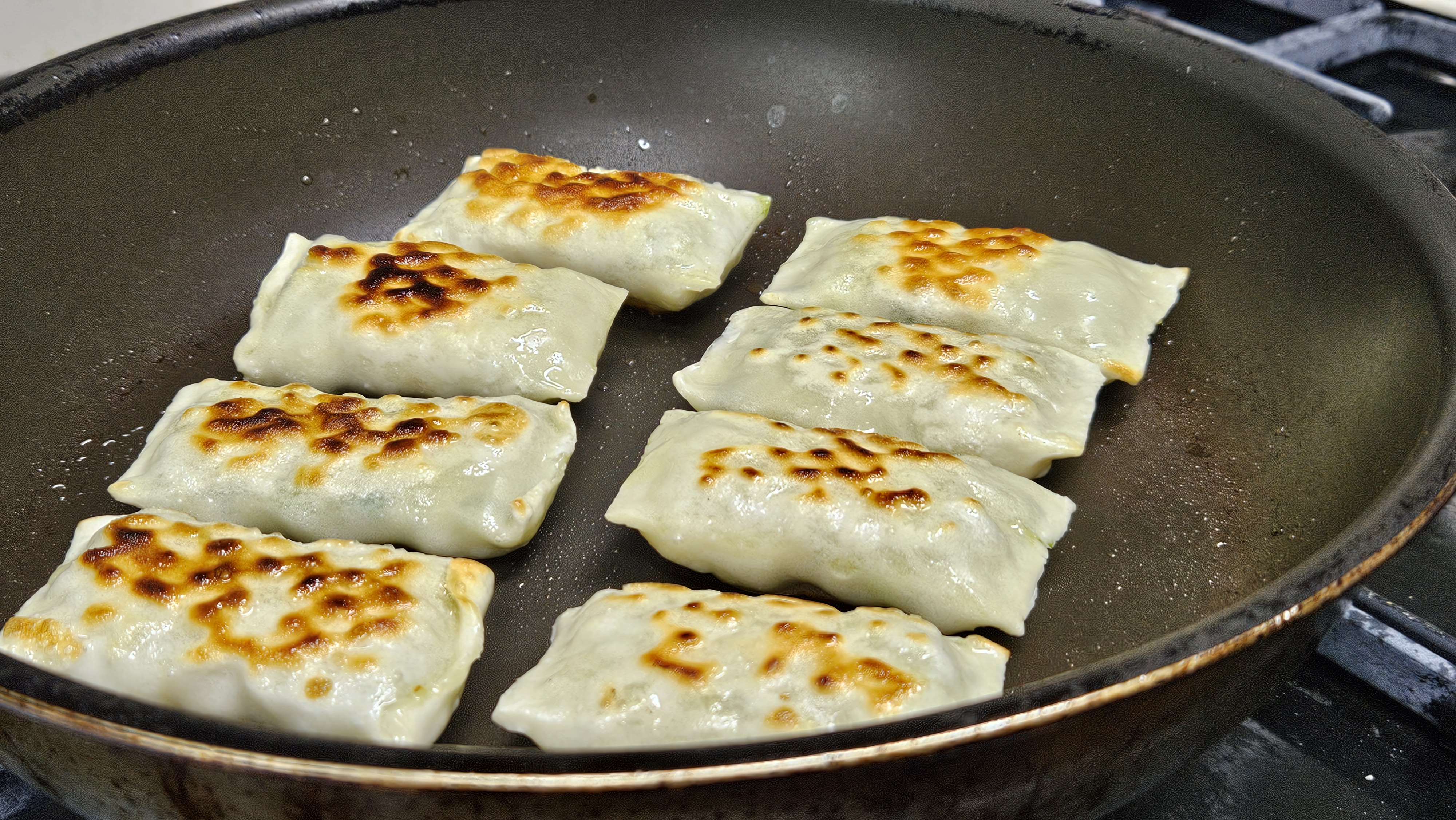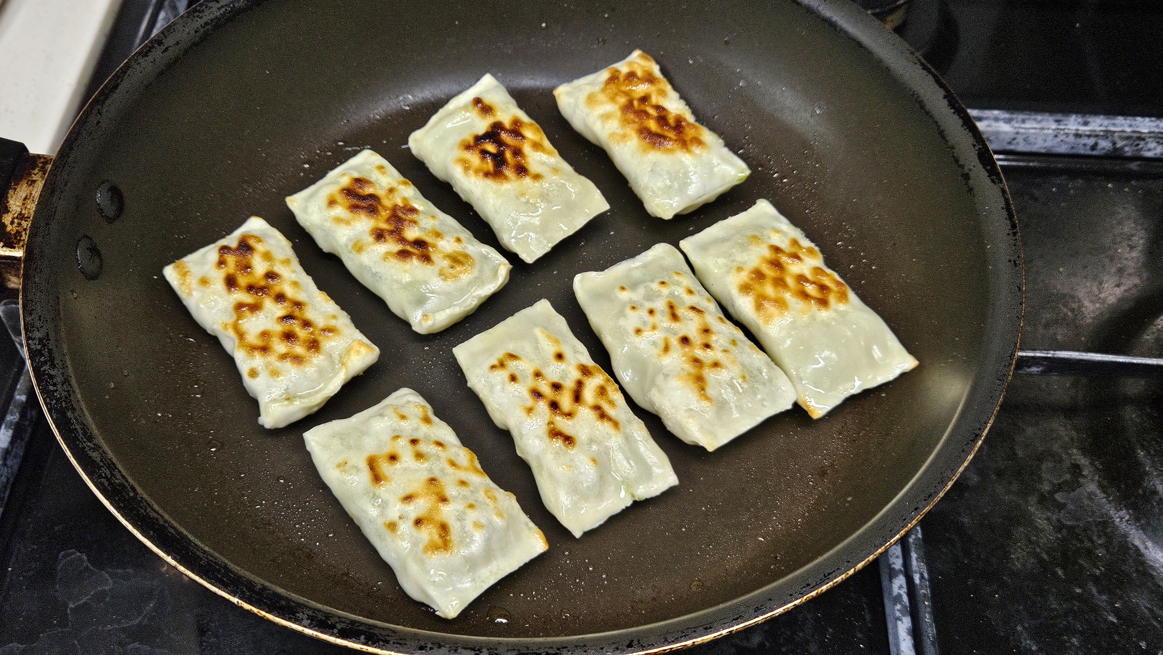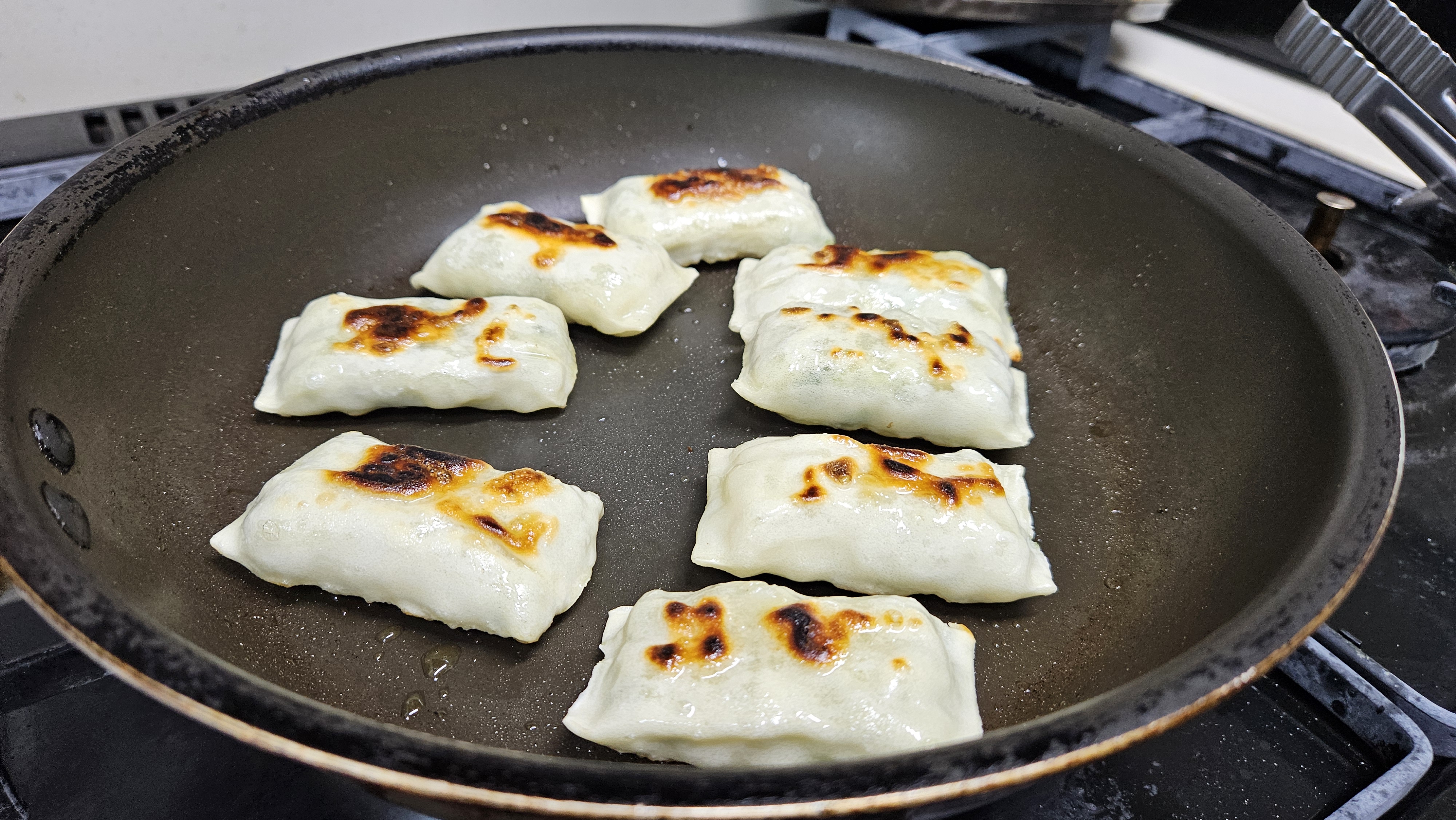 시간이 지나니 이 만두가 부풀어오르는 것... 꼭 가래떡 후라이팬에 구울때랑 비슷하게 만두피가 익을수록 색이 하애지면서 떡 부풀듯이 만두가 부불어 오른다.