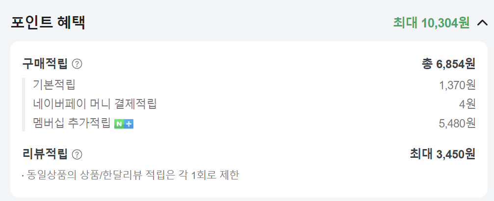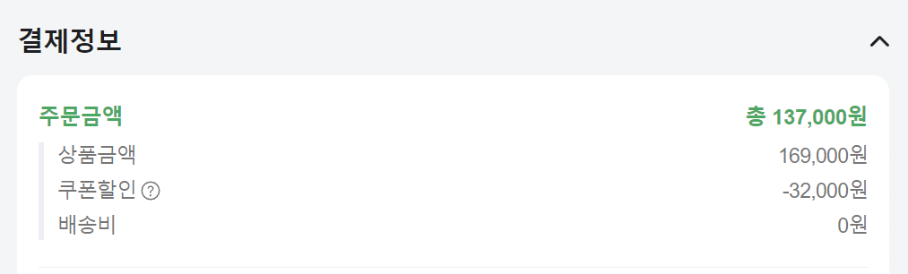 쿠폰할인 적용해서 137,000원에 구매했고, 10,304원을 포인트로 적립받았다.