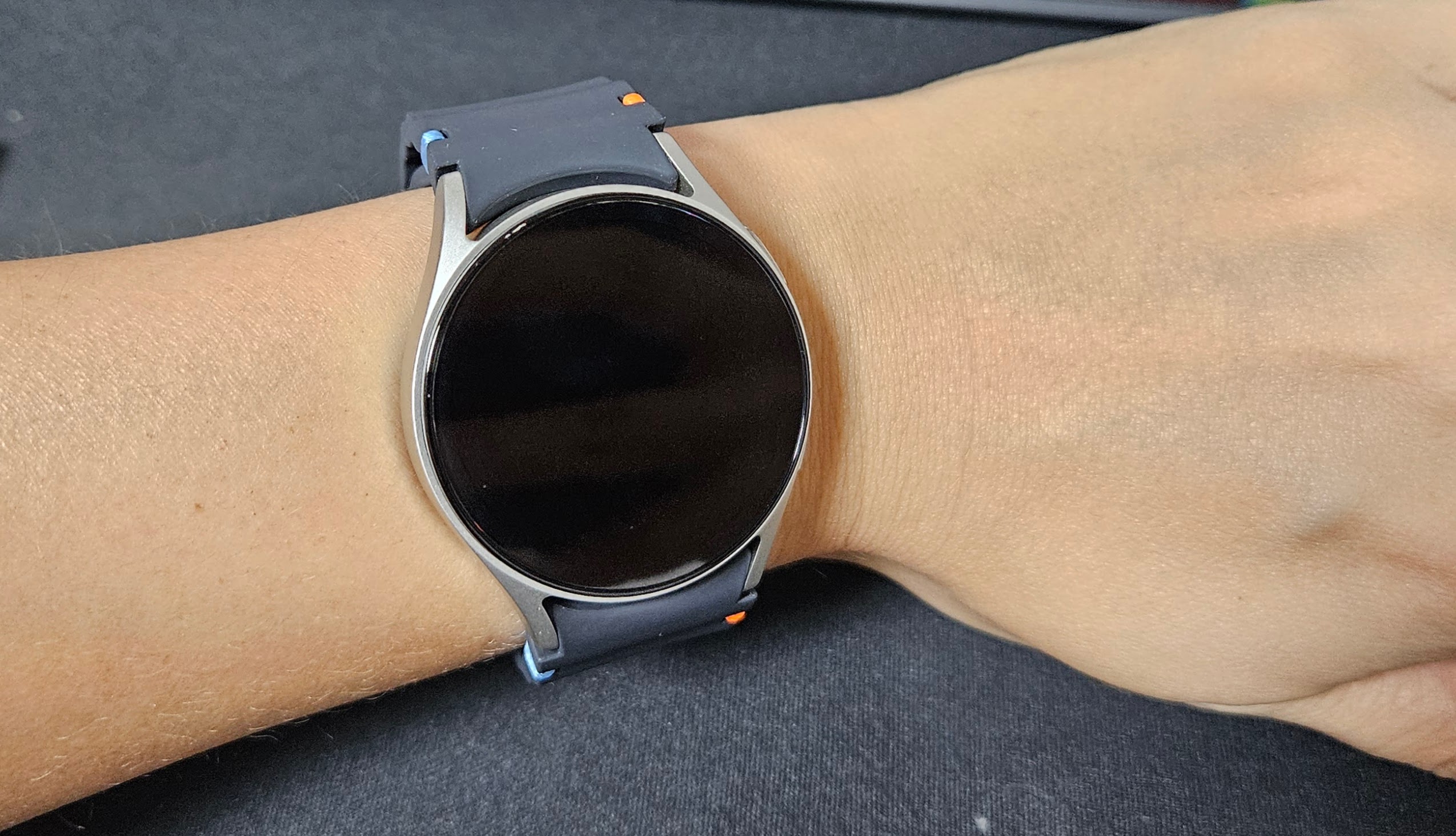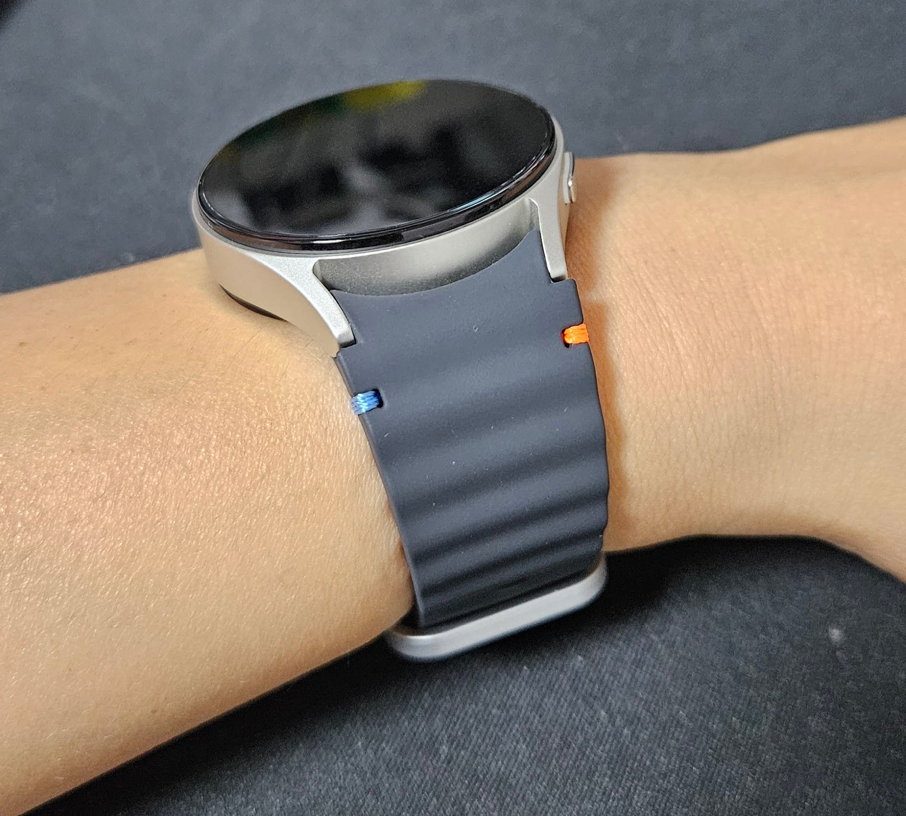 40미리 크림 갤럭시워치7에 다크그레이 스트랩을 끼워본 모습이다.