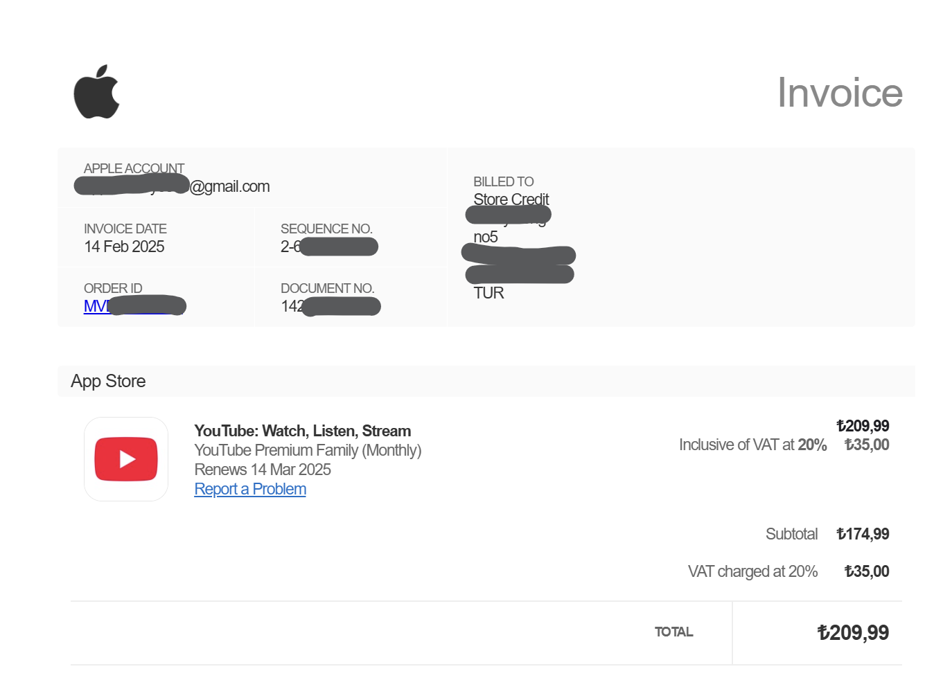 결제가 돌아간 이후 받은 애플 인보이스 메일. 세금이 20%나 붙어서 209.99 리라