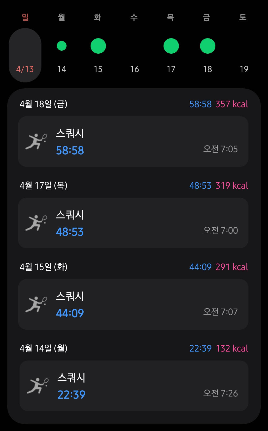 요즘 스쿼시 강습을 받고 있는데... 소모 칼로리 측정을 해봤다.