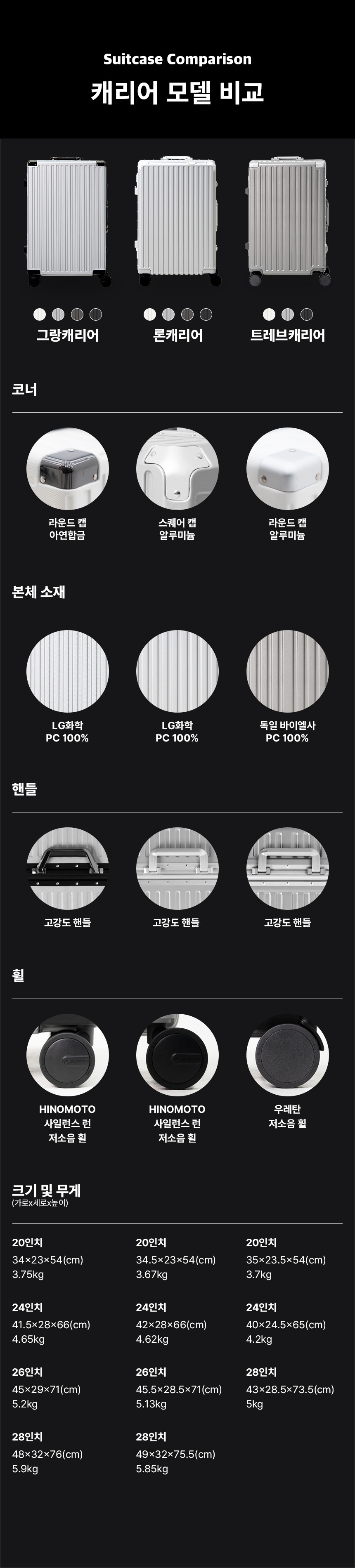 | 크기 및 무게 | 20인치: 34x23x54(cm), 3.75kg 24인치: 41x26x66(cm), 4.65kg 28인치: 49x29x71(cm), 5.2kg 32인치: 55x32x79(cm), 5.9kg |