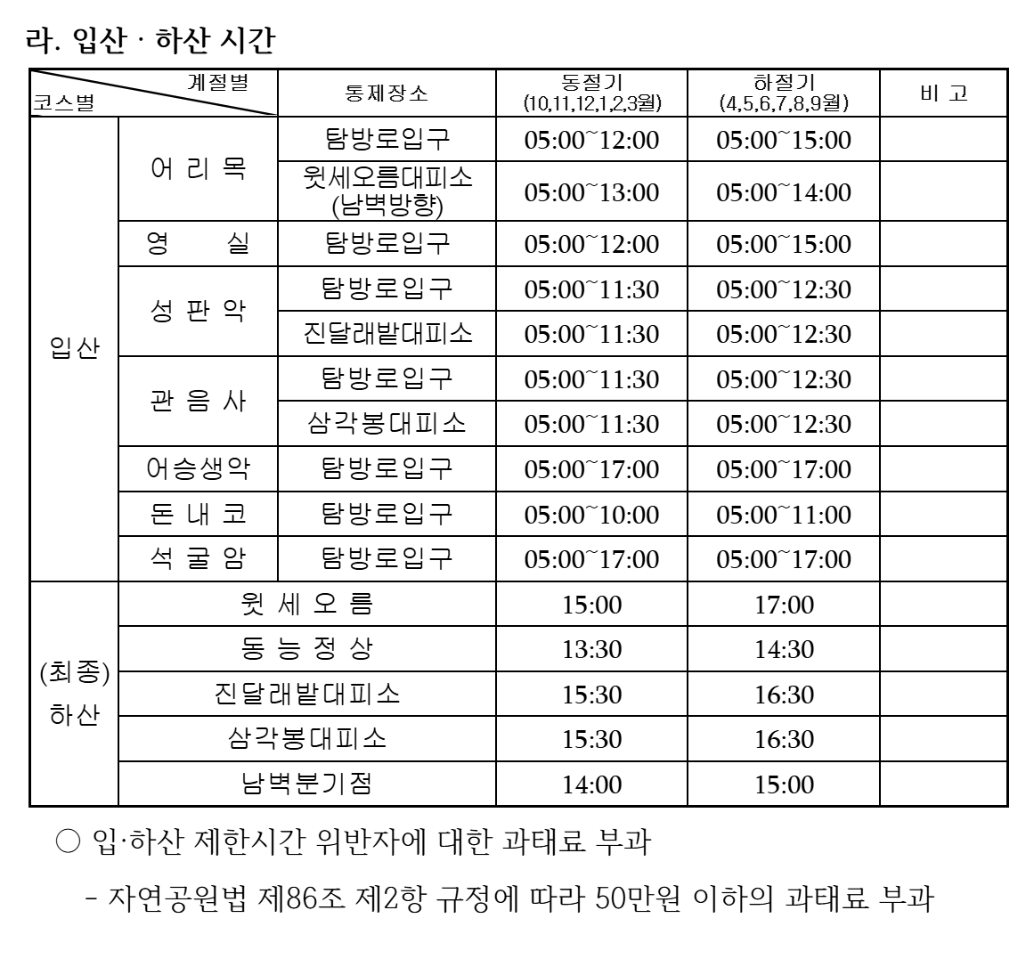 | 입산 | 어 리 목 | 탐방로입구 | 05:00~12:00 | 05:00~15:00 | |