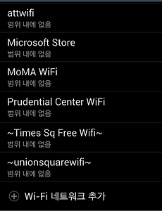 2007년에 여행갔을 땐,, 스마트폰도 없고 해서,, 책에 의존해서 여행을 다녔었는데,, 2013년의 여행에선 스마트폰 덕을 많이 봤다. 여튼 그래서 중요한게,, 바로 와이파이 상태인데,, 뉴욕 가기 전에 데이터로밍을 해야할지 말지 고민을 많이 했었는데,, 결론은 데이터 로밍을 할 필요가 없었다.. :) 한인민박을 이용하다 보니, 민박집 안에선 와이파이가 빵빵 잘터지고,, 스타벅스가 보이면 들어가서 와이파이 잡아서 쓰면 되고,, 미술관이나 박물관엔 무료 와이파이가 있는걸로 쓰면 되고,, 호스텔에선 호스텔 와이파이가 있고,,, 외부에선 와이파이가 안되는 곳도 많지만 되는 곳도 많다. * 아래는 미국에서 잡았던 와이파이 목록들... attwifi 는 스타벅스 것인데, 어느 스타벅스나 와이파이 이름이 동일했다..