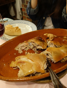 Meson De Candido 수도교 오른쪽 밑에 바로 위치하고 있어서 찾기는 완전 쉽다. 이 집은 꽃할배에 나와서 유명해진 집이기도 한데, 요기 말고 바로 옆집도 아기돼지요리를 하는 집이고,,수도교에서 백설공주성으로 올라가는 시내에도 곶곶세 아기돼지요리를 판다고 써붙은 가게가 많다. 시내로 올라가기 전에 식사예약을 하고 갔는데, 다녀왔떠니 예약이 안되있다고 해서 완전 황당했으나...예약이 제대로 되었는지 체크를 안하고 올라간게 문제,,;; 하지만 다행히 자리가 있어서 빈 자리에 앉아서 우리가 먹고싶어하던 아기돼지요리를 먹을 수 있었다. 아기돼지이긴 하지만,, 양이 많아서.. 4명이서 아기돼지 반도 아니고,, 반에 반만 시켰던 것 같다..;; 샹그리아랑, 샐러드랑 같이 먹었는데, 아주 부드러운 족발을 먹..