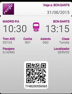 스페인 마드리드에 갔을 때, 의외라고 생각했던 것 중의 하나가,, QR코드 티켓을 실제로 많이 쓴다는 것,, 우리나라 같은 경우는 아직 전자티켓 같은 걸 실제로 쓰는 경우가 거의 없었던 것 같은데,, 그래고 스페인에서 WMC 행사를 하는건가 생각이 들기도 했다. ㅎㅎ 아래 왼쪽은 우리나라 KTX같은 스페인의 기차인 렌페(renfe) 티켓이고,,오른쪽은 마드리드 축구경기 티켓이다. 온라인으로 paypal 계정으로 결제를 하고,(직구 때문에 만들어둔 페이팔 계정을 스페인 여행에서 요긴하게 쓰게될줄은 몰랐다 ㅋ) 티켓을 프린트를 할수도 있지만 티켓 앱을 설치해서아래와 같이 QR코드로 기차 승차, 경기장 입장이 가능했다. 종이티켓을 따로 프린트 하지 않아서 종이 낭비를 하지 않아서 좋은 것 같았다.